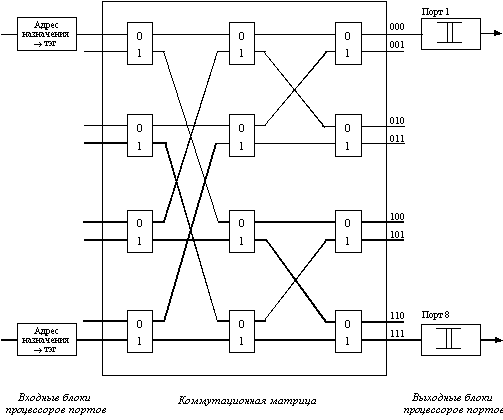 ![]() Рис. 4.2. Коммутационная матрица Более детальное представление одного из возможных вариантов реализации коммутационной матрицы для 8 портов дано на рисунке 4.3. Входные блоки процессоров портов на основании просмотра адресной таблицы коммутатора определяют по адресу назначения номер выходного порта. Эту информацию они добавляют к байтам исходного кадра в виде специального ярлыка - тэга (tag). Для данного примера тэг представляет просто 3-х разрядное двоичное число, соответствующее номеру выходного порта.