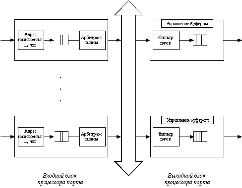 ![]() Рис. 4.5. Архитектура разделяемой памяти Входные блоки процессоров портов соединяются с переключаемым входом разделяемой памяти, а выходные блоки этих же процессоров соединяются с переключаемым выходом этой памяти. Переключением входа и выхода разделяемой памяти управляет менеджер очередей выходных портов. В разделяемой памяти менеджер организует несколько очередей данных, по одной для каждого выходного порта. Входные блоки процессоров передают менеджеру портов запросы на запись данных в очередь того порта, который соответствует адресу назначения пакета. Менеджер по очереди подключает вход памяти к одному из входных блоков процессоров и тот переписывает часть данных кадра в очередь определенного выходного порта. По мере заполнения очередей менеджер производит также поочередное подключение выхода разделяемой памяти к выходным блокам процессоров портов, и данные из очереди переписываются в выходной буфер процессора. Память должна быть достаточно быстродействующей для поддержания скорости переписи данных между N портами коммутатора. Применение общей буферной памяти, гибко распределяемой менеджером между отдельными портами, снижает требования к размеру буферной памяти процессора порта. Комбинированные коммутаторыУ каждой из описанных архитектур есть свои преимущества и недостатки, поэтому часто в сложных коммутаторах эти архитектуры применяются в комбинации друг с другом. Пример такого комбинирования приведен на рисунке 4.6. Коммутатор состоит из модулей с фиксированным количеством портов (2 - 8), выполненных на основе специализированной БИС (ASIC), реализующей архитектуру коммутационной матрицы. Если порты, между которыми нужно передать кадр данных, принадлежат одному модулю, то передача кадра осуществляется процессорами модуля на основе имеющейся в модуле коммутационной матрицы. Если же порты принадлежат разным модулям, то процессоры общаются по общей шине. При такой архитектуре передача кадров внутри модуля будет происходить чаще всего быстрее, чем при межмодульной передаче, так как коммутационная матрица - наиболее быстрый, хотя и наименее масштабируемый способ взаимодействия портов. Скорость внутренней шины коммутаторов может достигать нескольких Гб/c, а у наиболее мощных моделей - до 10 - 14 Гб/с.