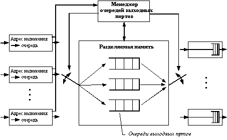 ![]() Рис. 4.4. Архитектура общей шины Входной блок процессора помещает в ячейку, переносимую по шине, тэг, в котором указывает номер порта назначения. Каждый выходной блок процессора порта содержит фильтр тэгов, который выбирает тэги, предназначенные данному порту. Шина, так же как и коммутационная матрица, не может осуществлять промежуточную буферизацию, но так как данные кадра разбиваются на небольшие ячейки, то задержек с начальным ожиданием доступности выходного порта в такой схеме нет. Коммутаторы с разделяемой памятьюТретья базовая архитектура взаимодействия портов - двухвходовая разделяемая память. Пример такой архитектуры приведен на рисунке 4.5.