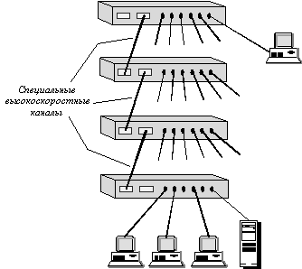 Первый тип коммутаторов обычно предназначен для организации небольших рабочих групп. Модульные коммутаторы на основе шасси чаще всего предназначены для применения на магистрали сети. Поэтому они выполняются на основе какой-либо комбинированной схемы, в которой взаимодействие модулей организуется по быстродействующей шине или же на основе быстрой разделяемой памяти большого объема. Модули такого коммутатора выполняются на основе технологии "hot swap", то есть допускают замену на ходу, без выключения коммутатора, так как центральное коммуникационное устройство сети не должно иметь перерывов в работе. Шасси обычно снабжается резервированными источниками питания и резервированными вентиляторами, в тех же целях. В целом такие коммутаторы напоминают маршрутизаторы высшего класса или корпоративные многофункциональные концентраторы, поэтому иногда они включают помимо модулей коммутации и модули повторителей или маршрутизатров. С технической точки зрения определенный интерес представляют стековые коммутаторы. Эти устройства представляют собой коммутаторы, которые могут работать автономно, так как выполнены в отдельном корпусе, но имеют специальные интерфейсы, которые позволяют их объединять в общую систему, которая работает как единый коммутатор. Говорят, что в этом случае отдельные коммутаторы образуют стек. Обычно такой специальный интерфейс представляет собой высокоскоростную шину, которая позволяет объединить отдельные корпуса подобно модулям в коммутаторе на основе шасси. Так как расстояния между корпусами больше, чем между модулями на шасси, скорость обмена по шине обычно ниже, чем у модульных коммутаторов: 200 - 400 Мб/c. Не очень высокие скорости обмена между коммутаторами стека обусловлены также тем, что стековые коммутаторы обычно занимают промежуточное положение между коммутаторами с фиксированным количеством портов и коммутаторами на основе шасси. Стековые коммутаторы применяются для создания сетей рабочих групп и отделов, поэтому сверхвысокие скорости шин обмена им не очень нужны и не соответствуют их ценовому диапазону. Структура стека коммутаторов, соединяемых по скоростным специальным портам, показана на рисунке 4.7.