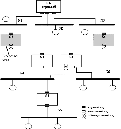 Поддержка алгоритма Spanning TreeАлгоритм Spanning Tree (STA) позволяет коммутаторам автоматически определять древовидную конфигурацию связей в сети при произвольном соединения портов между собой. Как уже отмечалось, для нормальной работы коммутатора требуется отсутствие замкнутых маршрутов в сети. Эти маршруты могут создаваться администратором специально для образования резервных связей или же возникать случайным образом, что вполне возможно, если сеть имеет многочисленные связи, а кабельная система плохо структурирована или документирована. Поддерживающие алгоритм STA коммутаторы автоматически создают активную древовидную конфигурацию связей (то есть связную конфигурацию без петель) на множестве всех связей сети. Такая конфигурация называется покрывающим деревом - Spanning Tree (иногда ее называют остовным или основным деревом), и ее название дало имя всему алгоритму. Коммутаторы находят покрывающее дерево адаптивно с помощью обмена служебными пакетами. Реализация в коммутаторе алгоритма STA очень важна для работы в больших сетях - если коммутатор не поддерживает этот алгоритм, то администратор должен самостоятельно определить, какие порты нужно перевести в заблокированное состояние, чтобы исключить петли. К тому же при отказе какой-либо связи, порта или коммутатора администратор должен, во-первых, обнаружить факт отказа, а, во-вторых, ликвидировать последствия отказа, переведя резервную связь в рабочий режим путем активизации некоторых портов. Основные определения В сети определяется корневой коммутатор (root switch), от которого строится дерево. Корневой коммутатор может быть выбран автоматически или назначен администратором. При автоматическом выборе корневым становится коммутатор с меньшим значением МАС-адреса его блока управления. Для каждого коммутатора определяется корневой порт (root port) - это порт, который имеет по сети кратчайшее расстояние до корневого коммутатора (точнее, до любого из портов корневого коммутатора). Затем для каждого сегмента сети выбирается так называемый назначенный порт (designated port) - это порт, который имеет кратчайшее расстояние от данного сегмента до корневого коммутатора. Понятие расстояния играет важную роль в построении покрывающего дерева. Именно по этому критерию выбирается единственный порт, соединяющий каждый коммутатор с корневым коммутатором, и единственный порт, соединяющий каждый сегмент сети с корневым коммутатором. Все остальные порты переводятся в резервное состояние, то есть такое, при котором они не передают обычные кадры данных. Можно доказать, что при таком выборе активных портов в сети исключаются петли и оставшиеся связи образуют покрывающее дерево. На рисунке 4.12 показан пример построения конфигурации покрывающего дерева для сети, состоящей из 6 сегментов (N1 - N6) и 6 коммутаторов (S1 - S6). Корневые порты закрашены черным цветом, назначенные не закрашены, а заблокированные порты перечеркнуты. В активной конфигурации коммутаторы S2 и S6 не имеют портов, передающих кадры данных, поэтому они закрашены как резервные.