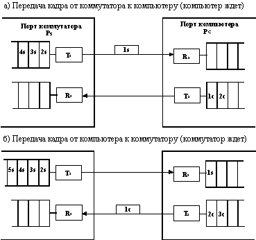 У пакета BPDU уведомления о реконфигурации отсутствуют все поля, кроме двух первых. После инициализации каждый коммутатор сначала считает себя корневым. Поэтому он начинает через интервал hello генерировать через все свои порты сообщения BPDU конфигурационного типа. В них он указывает свой идентификатор в качестве идентификатора корневого коммутатора (и в качестве данного коммутатора также), расстояние до корня устанавливается в 0, а в качестве идентификатора порта указывается идентификатор того порта, через который передается BPDU. Как только коммутатор получает BPDU, в котором имеется идентификатор корневого коммутатора, меньше его собственного, он перестает генерировать свои собственные кадры BPDU, а начинает ретранслировать только кадры нового претендента на звание корневого коммутатора. При ретрансляции кадров он наращивает расстояние до корня, указанное в пришедшем BPDU, на условное время сегмента, по которому принят данный кадр. При ретрансляции кадров каждый коммутатор для каждого своего порта запоминает минимальное расстояние до корня, встретившееся во всех принятых этим портом кадрах BPDU. При завершении процедуры установления конфигурации покрывающего дерева (по времени) каждый коммутатор находит свой корневой порт - это порт, который ближе других портов находится по отношению к корню дерева. Кроме этого, коммутаторы распределенным образом выбирают для каждого сегмента сети назначенный порт. Для этого они исключают из рассмотрения свой корневой порт, а для всех своих оставшихся портов сравнивают принятые по ним минимальные расстояния до корня с расстоянием до корня своего корневого порта. Если у своего порта это расстояние меньше принятых, то это значит, что он является назначенным портом. Все порты, кроме назначенных переводятся в заблокированное состояние и на этом построение покрывающего дерева заканчивается. В процессе нормальной работы корневой коммутатор продолжает генерировать служебные кадры, а остальные коммутаторы продолжают их принимать своими корневыми портами и ретранслировать назначенными. Если у коммутатора нет назначенных портов, то он все равно принимает служебные кадры корневым портом. Если по истечении тайм-аута корневой порт не получает служебный кадр, то он инициализирует новую процедуру построения покрывающего дерева. Способы управления потоком кадровНекоторые производители применяют в своих коммутаторах приемы управления потоком кадров, отсутствующие в стандартах протоколов локальных сетей, для предотвращения потерь кадров при перегрузках.