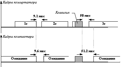 ![]() Рис. 4.13. Чередование передач кадров при обмене данными через коммутатор На рисунке 4.13 приведен пример обмена кадрами между коммутатором и портом сетевого адаптера компьютера в режиме пиковой загрузки коммутатора. Коммутатор не успевает передавать кадры из буфера передатчика Tx, так как при нормальном полудуплексном режиме работы передатчик должен часть времени простаивать, ожидая, пока приемник не примет очередной кадр от компьютера. Так как потери, даже небольшой доли кадров, обычно намного снижают полезную производительность сети, то при перегрузке коммутатора рационально было бы замедлить интенсивность поступления кадров от конечных узлов в приемники коммутатора, чтобы дать возможность передатчикам разгрузить свои буфера с более высокой скоростью. Алгоритм чередования передаваемых и принимаемых кадров (frame interleave) должен быть гибким и позволять компьютеру в критических ситуациях на каждый принимаемый кадр передавать несколько своих, причем не обязательно снижая при этом интенсивность приема до нуля, а просто уменьшая ее до необходимого уровня. Для реализации такого алгоритма в распоряжении коммутатора должен быть механизм снижения интенсивности трафика подключенных к его портам узлов. У некоторых протоколов локальных сетей, таких как FDDI, Token Ring или 100VG-AnyLAN имеется возможность изменять приоритет порта и тем самым давать порту коммутатора преимущество перед портом компьютера. У протоколов Ethernet и Fast Ethernet такой возможности нет, поэтому производители коммутаторов для этих очень популярных технологий используют два приема воздействия на конечные узлы. Эти приемы основаны на том, что конечные узлы строго соблюдают все параметры алгоритма доступа к среде, а порты коммутатора - нет. Первый способ "торможения" конечного узла основан на так называемом агрессивном поведении порта коммутатора при захвате среды после окончания передачи очередного пакета или после коллизии. Эти два случая иллюстрируются рисунком 4.14.
