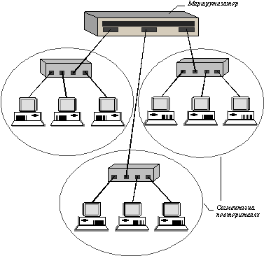 ![]() Рис. 4.15. Интерсеть, состоящая из сетей, построенных на основе повторителей При изменении состава сегментов (переход пользователя в другую сеть, дробление крупных сегментов) при таком подходе приходится производить физическую перекоммутацию разъемов на передних панелях повторителей или в кроссовых панелях, что не очень удобно в больших сетях - много физической работы, к тому же высока вероятность ошибки. Поэтому для устранения необходимости физической перекоммутации узлов стали применять многосегментные повторители (рисунок 4.16). В наиболее совершенных моделях таких повторителей приписывание отдельного порта к любому из внутренних сегментов производится программным путем, обычно с помощью удобного графического интерфейса. Примерами таких повторителей могут служить концентратор Distributed 5000 компании Bay Networks и концентратор PortSwitch компании 3Com. Программное приписывание порта сегменту часто называют статической или конфигурационной коммутацией.
