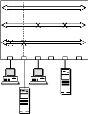 ![]() Рис. 4.16. Многосегментный повторитель с конфигурационной коммутацией Однако, решение задачи изменения состава сегментов с помощью повторителей накладывает некоторые ограничения на структуру сети - количество сегментов такого повторителя обычно невелико, поэтому выделить каждому узлу свой сегмент, как это можно сделать с помощью коммутатора, нереально. Поэтому сети, построенные на основе повторителей с конфигурационной коммутацией, по-прежнему основаны на разделении среды передачи данных между большим количеством узлов, и, следовательно, обладают гораздо меньшей производительностью по сравнению с сетями, построенными на основе коммутаторов. При использовании технологии виртуальных сетей в коммутаторах одновременно решаются две задачи: