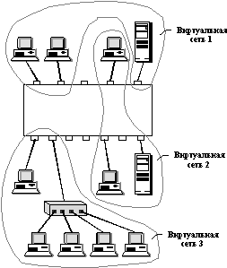 Для связи виртуальных сетей в интерсеть требуется привлечение сетевого уровня. Он может быть реализован в отдельном маршрутизаторе, а может работать и в составе программного обеспечения коммутатора. Технология образования и работы виртуальных сетей с помощью коммутаторов пока не стандартизована, хотя и реализуется в очень широком спектре моделей коммутаторов разных производителей. Положение может скоро измениться, если будет принят стандарт 802.1Q, разрабатываемый в рамках института IEEE. В виду отсутствия стандарта каждый производитель имеет свою технологию виртуальных сетей, которая, как правило, несовместима с технологией других производителей. Поэтому виртуальные сети можно создавать пока на оборудовании одного производителя. Исключение составляют только виртуальные сети, построенные на основе спецификации LANE (LAN Emulation), предназначенной для обеспечения взаимодействия АТМ-коммутаторов с традиционным оборудованием локальных сетей. При создании виртуальных сетей на основе одного коммутатора обычно используется механизм группирования в сети портов коммутатора (рисунок 4.17).