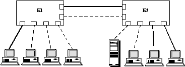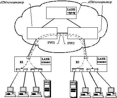 Коммутаторы К1 и К2, изображенные на рисунке, должны иметь АТМ-порты и поддерживать для реализации взаимодействия локальных сетей с сетью АТМ спецификацию LANE. Эту спецификацию должен поддерживать также хотя бы один из АТМ-коммутаторов. Так как спецификация LANE достаточно подробно описывает способ поддержки виртуальных сетей сетью АТМ-коммутаторов и пограничных коммутаторов, имеющих клиентскую часть протокола LANE, то оборудование разных производителей может работать в одной сети, образуя виртуальные сети с помощью АТМ-технологии. Спецификация LANE описывает способ взаимодействия локальных сетей и сетей АТМ на основе МАС-адресов и АТМ-адресов, не привлекая протоколы сетевого уровня. Поэтому она может быть реализована в коммутаторах, работающих только на канальном уровне. Для объединения виртуальных сетей, построенных с помощью спецификации LANE, нужны маршрутизаторы с АТМ-портами.