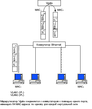 ![]() Рис. 4.20. Построение виртуальных сетей на основе сетевых адресов В случае, когда нужно произвести обмен информацией между узлами, принадлежащими разным виртуальным сетям, конечный узел работает так же, как если бы он находился в сетях, разделенных обычным маршрутизатором. Конечный узел направляет кадр маршрутизатору по умолчанию, указывая его МАС-адрес в кадре, а IP-адрес узла назначения - в пакете сетевого уровня. Маршрутизатором по умолчанию должен быть внутренний блок коммутатора, который имеет определенный МАС-адрес и IP-адрес, как и традиционный маршрутизатор. Кроме того, он должен иметь таблицу маршрутизации, в которой указывается выходной порт для всех номеров сетей, которые существуют в общей интерсети. В отличие от традиционных маршрутизаторов, у которых каждый порт имеет свой номер сети, коммутаторы, поддерживающие сетевой протокол для образования виртуальных сетей, назначают один и тот же номер сети нескольким портам. Кроме того, один и тот же порт может быть связан с несколькими номерами сетей, если через него связываются коммутаторы. Часто коммутаторы не поддерживают функции автоматического построения таблиц маршрутизации, которые поддерживаются протоколами маршрутизации. такими как RIP или OSPF. Такие коммутаторы называют коммутаторами 3-го уровня, чтобы подчеркнуть их отличие от традиционных маршрутизаторов. При использовании коммутаторов 3-го уровня таблицы маршрутизации либо создаются администратором вручную (это тоже часто приемлемо при небольшом количестве виртуальных сетей и маршруте по умолчанию к полноценному маршрутизатору), либо загружаются из маршрутизатора. По последней схеме взаимодействует коммутатор Catalist 5000 компании Cisco с маршрутизаторами этой же компании. Если же коммутатор не поддерживает функций сетевого уровня, то его виртуальные сети могут быть объединены только с помощью внешнего маршрутизатора. Некоторые компании выпускают специальные маршрутизаторы для применения совместно с коммутаторами. Примером такого маршрутизатора служит маршрутизатор Vgate компании RND, изображенный на рисунке 4.21.