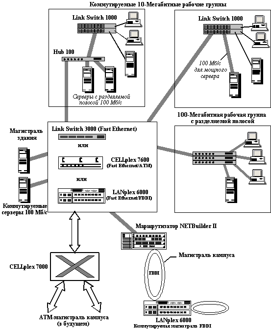 ![]() Рис. 1.17. Варианты модернизации сети университета на основе технологии Fast Ethernet Третий вариант организации рабочей группы является комбинацией двух первых. В нем используется как коммутируемая 10-Мегабитная среда для рабочих станций, так и разделяемая 100-Мегабитная среда для производительных серверов этой рабочей группы. Для создания магистрали здания 3Сом предлагает также использовать технологию Fast Ethernet, но в коммутируемом варианте. Все связи от рабочих групп подключаются к 100 Мегабитным портам коммутатора. В качестве такого коммутатора предлагается три типа коммутаторов. Наиболее дешевое решение - коммутатор LinkSwitch 3000, который поддерживает только технологию Fast Ethernet, и имеет 8 портов TX или FX. Коммутатор CELLplex 7600 поддерживает до 64 портов Fast Ethernet и может иметь интерфейсный модуль с 4 портами АТМ. Эти порты могут понадобиться в будущем, при переходе от магистрали FDDI к магистрали АТМ как в здании, так и в сети кампуса. И, наконец, многофункциональный коммутатор LANplex 6000, поддерживающий коммутацию Fast Ethernet и FDDI, может быть полезен в том случае, когда магистраль кампуса останется на технологии FDDI. В случае использования коммутаторов LinkSwitch 3000 или CELLplex 7600 в центре сети здания, 3Сом предлагает использовать для подключения к магистрали FDDI кампуса маршрутизаторы NETBuilder II с интерфейсами Fast Ethernet и FDDI. Маршрутизатор осуществляет переход с Fast Ethernet на FDDI, а также изолирует сеть здания от проблем сетей других зданий типа широковещательного шторма. В случае использования в центре сети здания коммутатора LANplex 6000 можно отказаться от использования маршрутизатора, так как LANplex 6000 может обеспечить трансляцию Fast Ethernet-FDDI, а также за счет поддержки функций маршрутизатора изолировать сети зданий друг от друга. К центру коммутации данных здания подключены по интерфейсу Fast Ethernet и мощные серверы, общие для всех рабочих групп здания. Развитие магистрали кампуса 3Сом видит следующим образом. Первый этап развития - переход от разделяемого всеми зданиями кольца FDDI к нескольким кольцам, коммутируемым с помощью LANplex 6000. Второй этап - переход на АТМ магистраль, построенную на коммутаторах CELLplex 7000 фирмы 3Сом. Это решение должно обеспечить лучшую масштабируемость магистрали - за счет возможности использования связей между магистральными коммутаторами на скорости 622 Мб/c. Кроме того, технология АТМ стандартным способом обеспечивает сочетание компьютерного и мультимедийного трафика на одной магистрали.