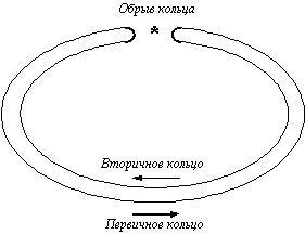 Сеть FDDI строится на основе двух оптоволоконных колец, которые образуют основной и резервный пути передачи данных между узлами сети. Использование двух колец - это основной способ повышения отказоустойчивости в сети FDDI, и узлы, которые хотят им воспользоваться, должны быть подключены к обоим кольцам. В нормальном режиме работы сети данные проходят через все узлы и все участки кабеля первичного (Primary) кольца, поэтому этот режим назван режимом Thru - "сквозным" или "транзитным". Вторичное кольцо (Secondary) в этом режиме не используется. В случае какого-либо вида отказа, когда часть первичного кольца не может передавать данные (например, обрыв кабеля или отказ узла), первичное кольцо объединяется со вторичным (рисунок 2.1), образуя вновь единое кольцо. Этот режим работы сети называется Wrap, то есть "свертывание" или "сворачивание" колец. Операция свертывания производится силами концентраторов и/или сетевых адаптеров FDDI. Для упрощения этой процедуры данные по первичному кольцу всегда передаются против часовой стрелки, а по вторичному - по часовой. Поэтому при образовании общего кольца из двух колец передатчики станций по-прежнему остаются подключенными к приемникам соседних станций, что позволяет правильно передавать и принимать информацию соседними станциями. В стандартах FDDI отводится много внимания различным процедурам, которые позволяют определить наличие отказа в сети, а затем произвести необходимую реконфигурацию. Сеть FDDI может полностью восстанавливать свою работоспособность в случае единичных отказов ее элементов. При множественных отказах сеть распадается на несколько не связанных сетей.
