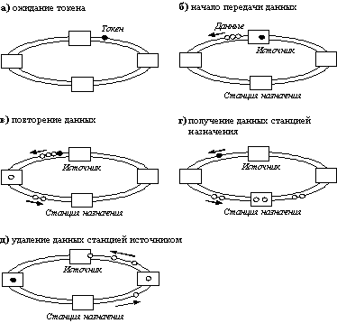 ![]() Рис. 2.1. Реконфигурация колец FDDI при отказе Кольца в сетях FDDI рассматриваются как общая разделяемая среда передачи данных, поэтому для нее определен специальный метод доступа. Этот метод очень близок к методу доступа сетей Token Ring и также называется методом маркерного (или токенного) кольца - token ring (рисунок 2.2, а). Станция может начать передачу своих собственных кадров данных только в том случае, если она получила от предыдущей станции специальный кадр - токен доступа (рисунок 2.2, б). После этого она может передавать свои кадры, если они у нее имеются, в течение времени, называемого временем удержания токена - Token Holding Time (THT). После истечения времени THT станция обязана завершить передачу своего очередного кадра и передать токен доступа следующей станции. Если же в момент принятия токена у станции нет кадров для передачи по сети, то она немедленно транслирует токен следующей станции. В сети FDDI у каждой станции есть предшествующий сосед (upstream neighbor) и последующий сосед (downstream neighbor), определяемые ее физическими связями и направлением передачи информации.