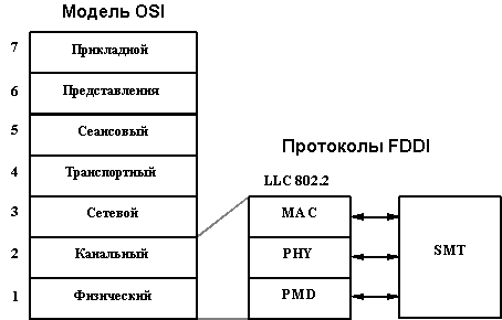 ![]() Рис. 2.3. Структура протоколов технологии FDDI Физический уровень разделен на два подуровня: независимый от среды подуровень PHY (Physical), и зависящий от среды подуровень PMD (Physical Media Dependent). Работу всех уровней контролирует протокол управления станцией SMT (Station Management). Уровень PMD обеспечивает необходимые средства для передачи данных от одной станции к другой по оптоволокну. В его спецификации определяются: