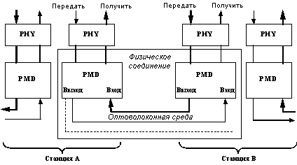Спецификация зависящего от среды физического подуровня PMDСтруктура физического соединенияРассмотрим физический подуровень PMD (Physical Media Dependent layer), определенный в стандарте FDDI для оптоволокна - Fiber PMD. Эта спецификация определяет аппаратные компоненты для создания физических соединений между станциями: оптические передатчики, оптические приемники, параметры кабеля, оптические разъемы. Для каждого из этих элементов указываются конструктивные и оптические параметры, позволяющие станциям устойчиво взаимодействовать на определенных расстояниях. Физическое соединение - основной строительный блок сети FDDI. Типичная структура физического соединения представлена на рисунке 2.10.