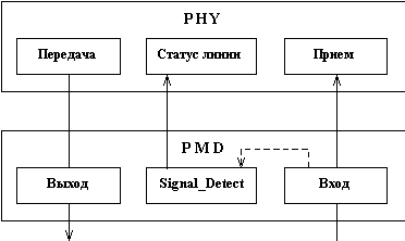 ![]() Рис. 2.11. Ключи разъемов MIC Кроме разъемов MIC, допускается использовать разъемы ST и SC, выпускаемые промышленностью. В качестве источника света допускается использование светодиодов (LED) или лазерных диодов с длиной волны 1.3 мкм. Кроме многомодового кабеля, допускается использование более качественного одномодового кабеля (Single Mode Fiber, SMF) и разъемов SMF-MIC для этого кабеля. В этом случае дальность физического соединения между соседними узлами может увеличиться до 40 км - 60 км, в зависимости от качества кабеля, разъемов и соединений. Требования, определенные в спецификации SMF-PMD, для мощности на выходе передатчика и входе приемника, те же, что и для одномодового кабеля. Функция определения сигнала уровня PMDСпецификация на Fiber PMD требует от этого уровня выполнения функции Signal_Detect по определению факта наличия оптических сигналов на входе физического соединения станции. Этот сигнал передается на уровень PHY, где используется функцией определения статуса линии Line State Detect (рисунок 2.12). Уровень PMD генерирует для PHY признак присутствия оптического сигнала Signal_Detect, если мощность входного сигнала превышает -43.5 dBm, а снимает его при уменьшении этой мощности до -45 dBm и ниже. Таким образом, имеется гистерезис в 1.5 dBm для предотвращения частых изменений статуса линии при колебании входной мощности сигнала около -45 dBm.