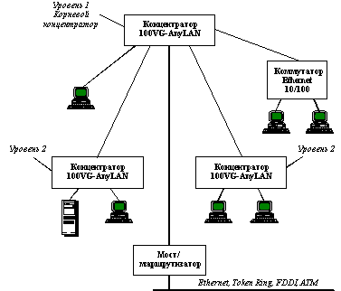 Технология 100VG-AnyLANОбщая характеристика технологии 100VG-AnyLANВ качестве альтернативы технологии Fast Ethernet, фирмы AT&T и HP выдвинули проект новой технологии со скоростью передачи данных 100 Мб/с - 100Base-VG. В этом проекте было предложено усовершенствовать метод доступа с учетом потребности мультимедийных приложений, при этом сохранить совместимость формата пакета с форматом пакета сетей 802.3. В сентябре 1993 года по инициативе фирм IBM и HP был образован комитет IEEE 802.12, который занялся стандартизацией новой технологии. Проект был расширен за счет поддержки в одной сети кадров не только формата Ethernet, но и формата Token Ring. В результате новая технология получила название 100VG-AnyLAN, то есть технология для любых сетей (Any LAN - любые сети), имея в виду, что в локальных сетях технологии Ethernet и Token Ring используются в подавляющем количестве узлов. Летом 1995 года технология 100VG-AnyLAN получила статус стандарта IEEE 802.12. В технологии 100VG-AnyLAN определены новый метод доступа Demand Priority и новая схема квартетного кодирования Quartet Coding, использующая избыточный код 5В/6В. Метод доступа Demand Priority основан на передаче концентратору функций арбитра, решающего проблему доступа к разделяемой среде. Метод Demand Priority повышает коэффициент использования пропускной способности сети за счет введения простого, детерминированного метода разделения общей среды, использующего два уровня приоритетов: низкий - для обычных приложений и высокий - для мультимедийных. Технология 100VG-AnyLAN имеет меньшую популярность среди производителей коммуникационного оборудования, чем конкурирующее предложение - технология Fast Ethernet. Компании, которые не поддерживают технологию 100VG-AnyLAN, объясняют это тем, что для большинства сегодняшних приложений и сетей достаточно возможностей технологии Fast Ethernet, которая не так заметно отличается от привычной большинству пользователей технологии Ethernet. В более далекой перспективе эти производители предлагают использовать для мультимедийных приложений технологию АТМ, а не 100VG-AnyLAN. Тем не менее, число сторонников технологии 100VG-AnyLAN растет и насчитывает около 30 компаний. Среди них находятся не только копании Hewlett-Packard и IBM, но и такие лидеры как Cisco Systems, Cabletron, D-Link и другие. Все эти компании поддерживают обе конкурирующие технологии в своих продуктах, выпуская модули с портами как Fast Ethernet, так и 100VG-AnyLAN. Структура сети 100VG-AnyLAN Сеть 100VG-AnyLAN всегда включает центральный концентратор, называемый концентратором уровня 1 или корневым концентратором (рисунок 3.1). Корневой концентратор имеет связи с каждым узлом сети, образуя топологию типа звезда. Этот концентратор представляет собой интеллектуальный центральный контроллер, который управляет доступом к сети, постоянно выполняя цикл "кругового" сканирования своих портов и проверяя наличие запросов на передачу кадров от присоединенных к ним узлов. Концентратор принимает кадр от узла, выдавшего запрос, и передает его только через тот порт, к которому присоединен узел c адресjv, совпадающиv с адресом назначения, указанным в кадре.