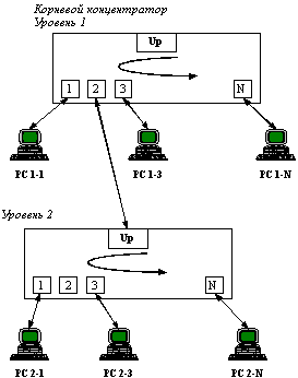 ![]() Рис. 3.1 . Структура сети 100VG-AnyLAN Каждый концентратор может быть сконфигурирован на поддержку либо кадров 802.3 Ethernet, либо кадров 802.5 Token Ring. Все концентраторы, расположенные в одном и том же логическом сегменте (не разделенном мостами, коммутаторами или маршрутизаторами), должны быть сконфигурированы на поддержку кадров одного типа. Для соединения сетей 100VG-AnyLAN, использующих разные форматы кадров 802.3, нужен мост, коммутатор или маршрутизатор. Аналогичное устройство требуется и в том случае, когда сеть 100VG-AnyLAN должна быть соединена с сетью FDDI или АТМ. Каждый концентратор имеет один "восходящий" (up-link) порт и N "нисходящих" портов (down-link), как это показано на рисунке 3.2.