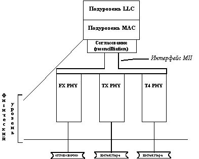 Спецификации физического уровняСтруктура физического уровня и его связь с MAC-подуровнемДля технологии Fast Ethernet разработаны различные варианты физического уровня, отличающиеся не только типом кабеля и электрическими параметрами импульсов, как это сделано в технологии 10 Мб/с Ethernet, но и способом кодирования сигналов и количеством используемых в кабеле проводников. Поэтому физический уровень Fast Ethernet имеет более сложную структуру, чем классический Ethernet. Эта структура представлена на рисунке 1.4.