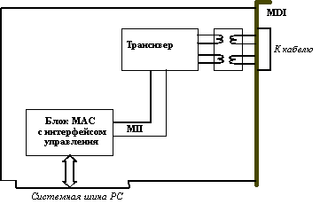 Устройство физического уровня (PHY) обеспечивает кодирование данных, поступающих от MAC-подуровня для передачи их по кабелю определенного типа, синхронизацию передаваемых по кабелю данных, а также прием и декодирование данных в узле-приемнике. Интерфейс MII поддерживает независимый от используемой физической среды способ обмена данными между MAC-подуровнем и подуровнем PHY. Этот интерфейс аналогичен по назначению интерфейсу AUI классического Ethernet'а за исключением того, что интерфейс AUI располагался между подуровнем физического кодирования сигнала (для любых вариантов кабеля использовался одинаковый метод физического кодирования - манчестерский код) и подуровнем физического присоединения к среде, а интерфейс MII располагается между MAC-подуровнем и подуровнями кодирования сигнала, которых в стандарте Fast Ethernet три - FX, TX и T4. Подуровень согласования нужен для того, чтобы согласовать работу подуровня MAC с интерфейсом MII. Интерфейс MIIСуществует два варианта реализации интерфеса MII: внутренний и внешний. При внутреннем варианте микросхема, реализующая подуровни MAC и согласования, с помощью интерфеса MII соединяется с микросхемой трансивера внутри одного и того же конструктива, например, платы сетевого адаптера или модуля маршрутизатора (рисунок 1.5). Микросхема трансивера реализует все функции устройства PHY.