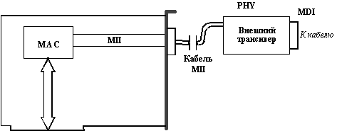 ![]() Рис. 1.5. Сетевой адаптер с внутренним интерфейсом MII Внешний вариант соответствует случаю, когда трансивер вынесен в отдельное устройство и соединен кабелем MII через разъем MII с микросхемой MAC-подуровня (рисунок 1.6). Разъем MII в отличие от разъема AUI имеет 40 контактов, максимальная длина кабеля MII составляет 1 метр. Сигналы, передаваемые по интерфейсу MII, имеют амплитуду 5 В.
