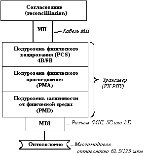 Физический уровень 100Base-FX - многомодовое оптоволокноФизический уровень PHY ответственен за прием данных в параллельной форме от MAC-подуровня, трансляцию их в один (TX или FX) или три последовательных потока бит с возможностью побитной синхронизации и передачу их через разъем на кабель. Аналогично, на приемном узле уровень PHY должен принимать сигналы по кабелю, определять моменты синхронизации бит, извлекать биты из физических сигналов, преобразовывать их в параллельную форму и передавать подуровню MAC. Структура физического уровня 100Base-FX представлена на рисунке 1.8.