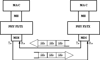 ![]() Рис. 1.8. Физический уровень PHY FX Эта спецификация определяет работу протокола Fast Ethernet по многомодовому оптоволокну в полудуплексном и полнодуплексном режимах на основе хорошо проверенной схемы кодирования и передачи оптических сигналов, использующейся уже на протяжении ряда лет в стандарте FDDI. Как и в стандарте FDDI, каждый узел соединяется с сетью двумя оптическими волокнами, идущими от приемника (Rx) и от передатчика (Tx). Между спецификациями PHY FX и PHY TX есть много общего, поэтому общие для двух спецификаций свойства будут даваться под обобщенным названием PHY FX/TX. Метод кодирования 4B/5B10 Мб/с версии Ethernet используют манчестерское кодирование для представления данных при передаче по кабелю. Метод кодирования 4B/5B определен в стандарте FDDI, и он без изменений перенесен в спецификацию PHY FX/TX. При этом методе каждые 4 бита данных MAC-подуровня (называемых символами) представляются 5 битами. Использование избыточного бита позволяет применить потенциальные коды при представлении каждого из пяти бит в виде электрических или оптических импульсов. Потенциальные коды обладают по сравнению с манчестерскими кодами более узкой полосой спектра сигнала, а, следовательно, предъявляют меньшие требования к полосе пропускания кабеля. Однако, прямое использование потенциальных кодов для передачи исходных данных без избыточного бита невозможно из-за плохой самосинхронизации приемника и источника данных: при передаче длинной последовательности единиц или нулей в течение долгого времени сигнал не изменяется, и приемник не может определить момент чтения очередного бита. При использовании пяти бит для кодирования шестнадцати исходных 4-х битовых комбинаций, можно построить такую таблицу кодирования, в которой любой исходный 4-х битовый код представляется 5-ти битовым кодом с чередующимися нулями и единицами. Тем самым обеспечивается синхронизация приемника с передатчиком. Так как исходные биты MAC-подуровня должны передаваться со скоростью 100Мб/c, то наличие одного избыточного бита вынуждает передавать биты результирующего кода 4B/5B со скоростью 125 Мб/c, то есть межбитовое расстояние в устройстве PHY составляет 8 наносекунд. Так как из 32 возможных комбинаций 5-битовых порций для кодирования порций исходных данных нужно только 16, то остальные 16 комбинаций в коде 4В/5B используются в служебных целях. Наличие служебных символов позволило использовать в спецификациях FX/TX схему непрерывного обмена сигналами между передатчиком и приемником и при свободном состоянии среды, что отличает их от спецификации 10Base-T, когда незанятое состояние среды обозначается полным отсутствием на ней импульсов информации. Для обозначения незанятого состояния среды используется служебный символ Idle (11111), который постоянно циркулирует между передатчиком и приемником, поддерживая их синхронизм и в периодах между передачами информации, а также позволяя контролировать физическое состояние линии (рисунок 1.9).