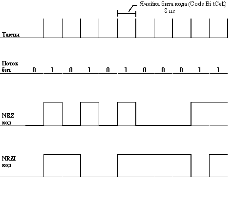 ![]() Рис. 1.10. Непрерывный поток данных спецификаций PHY FX/TX Передача 5-битовых кодов по линии методом NRZIПосле преобразования 4-битовых порций MAC-кодов в 5-битовые порции PHY их необходимо представить в виде оптических или электрических сигналов в кабеле, соединяющем узлы сети. Спецификации PHY FX и PHY TX используют для этого различные методы физического кодирования - NRZI и MLT-3 соответственно. Эти же методы определены в стандарте FDDI для передачи сигналов по оптоволокну (спецификация PMD) и витой паре (спецификация TP-PMD). Рассмотрим метод NRZI - Non Return to Zero Invert to ones - метод без возврата к нулю с инвертированием для единиц. Этот метод представляет собой модификацию простого потенциального метода кодирования, называемого Non Return to Zero (NRZ), когда для представления 1 и 0 используются потенциалы двух уровней. В методе NRZI также используется два уровня потенциала сигнала, но потенциал, используемый для кодирования текущего бита зависит от потенциала, который использовался для кодирования предыдущего бита (так называемое дифференциальное кодирование). Если текущий бит имеет значение 1, то текущий потенциал представляет собой инверсию потенциала предыдущего бита, независимо от его значения. Если же текущий бит имеет значение 0, то текущий потенциал повторяет предыдущий. Из описания метода NRZI видно, что для обеспечения частых изменений сигнала, а значит и для поддержания самосинхронизации приемника, нужно исключить из кодов слишком длинные последовательности нулей. Коды 4B/5B построены так, что гарантируют не более трех нулей подряд при любом сочетании бит в исходной информации. На рисунке 1.11 приведен пример кодирования последовательности бит методами NRZ и NRZI.