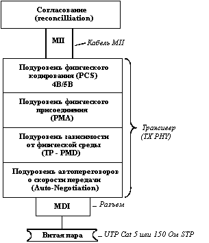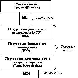 ![]() Рис. 1.4. Структура физического уровня Fast Ethernet Физический уровень состоит из трех подуровней: