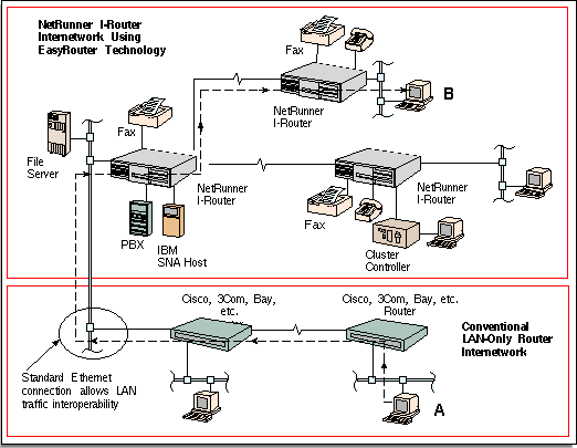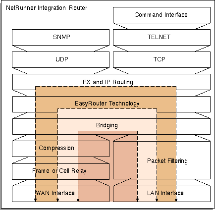 Рисунок 6. Использование маршрутизаторов EasyRouter совместно с традиционными устройствами. На рисунке 7 схематически показана архитектура стека интерфейсов NetRunner. Отметим, что поток LAN-WAN может передаваться различными способами как через прозрачный мост, с использованием технологии EasyRouting или традиционной маршрутизации IP/IPX архитектура NetRunner поддерживает все три способа. Преимущества компрессии трафика и фильтрации пакетов применимы для всех трех вариантов и могут использоваться в сети с ретрансляцией кадров или коммутацией ячеек в WAN-сети. Протоколы TCP и UDP также могут использоваться во всех трех случаях, а для приложений (TELNET, SNMP, и т.п.) видны только протоколы уровня 4.