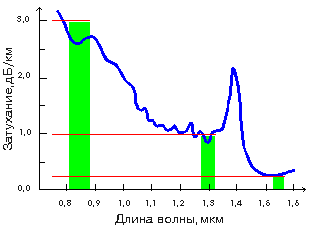 Затухание зависит от длины волны излучения, вводимого в волокно. В настоящее время передачу сигналов по волокну осуществляют в трех диапазонах: 0.85 мкм, 1.3 мкм, 1.55 мкм, так как именно в этих диапазонах кварц имеет повышенную прозрачность. Другой важнейший параметр оптического волокна - дисперсия. Дисперсия - это рассеяние во времени спектральных и модовых составляющих оптического сигнала. Существуют три типа дисперсии: модовая, материальная и волноводная. модовая дисперсия присуща многомодовому волокну и обусловлена наличием большого числа мод, время распространения которых различно материальная дисперсия обусловлена зависимостью показателя преломления от длины волны волноводная дисперсия обусловлена процессами внутри моды и характеризуется зависимостью скорости распространения моды от длины волны. Поскольку светодиод или лазер излучает некоторый спектр длин волн, дисперсия приводит к уширению импульсов при распространению по волокну и тем самым порождает искажения сигналов. При оценке пользуются термином "полоса пропускания" - это величина, обратная к величине уширения импульса при прохождении им по оптическому волокну расстояния в 1 км. Измеряется полоса пропускания в МГц*км. Из определения полосы пропускания видно, что дисперсия накладывает ограничение на дальность передачи и на верхнюю частоту передаваемых сигналов. Если при распространении света по многомодовому волокну как правило преобладает модовая дисперсия, то одномодовому волокну присущи только два последних типа дисперсии. На длине волны 1.3 мкм материальная и волноводная дисперсии в одномодовом волокне компенсируют друг друга, что обеспечивает наивысшую пропускную способность. Затухание и дисперсия у разных типов оптических волокон различны. Одномодовые волокна обладают лучшими характеристиками по затуханию и по полосе пропускания, так как в них распространяется только один луч. Однако, одномодовые источники излучения в несколько раз дороже многомодовых. В одномодовое волокно труднее ввести излучение из-за малых размеров световодной жилы, по этой же причине одномодовые волокна сложно сращивать с малыми потерями. Оконцевание одномодовых кабелей оптическими разъемами также обходится дороже. Многомодовые волокна более удобны при монтаже, так как в них размер световодной жилы в несколько раз больше, чем в одномодовых волокнах. Многомодовый кабель проще оконцевать оптическими разъемами с малыми потерями (до 0.3 dB) в стыке. На многомодовое волокно расчитаны излучатели на длину волны 0.85 мкм - самые доступные и дешевые излучатели, выпускаемые в очень широком ассортименте. Но затухание на этой длине волны у многомодовых волокон находится в пределах 3-4 dB/км и не может быть существенно улучшено. Полоса пропускания у многомодовых волокон достигает 800 МГц*км, что приемлемо для локальных сетей связи, но не достаточно для магистральных линий. |