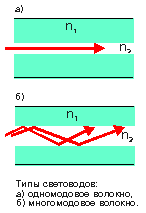 В одномодовом волокне диаметр световодной жилы порядка 8-10 мкм, то есть сравним с длиной световой волны. При такой геометрии в волокне может распространяться только один луч (одна мода). В многомодовом волокне размер световодной жилы порядка 50-60 мкм, что делает возможным распространение большого числа лучей (много мод). Оба типа волокна характеризуются двумя важнейшими параметрами: затуханием и дисперсией. Затухание обычно измеряется в дБ/км и определяется потерями на поглощение и на рассеяние излучения в оптическом волокне. Потери на поглощение зависят от чистоты материала, потери на рассеяние зависят от неоднородностей показателя преломления материала.