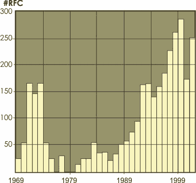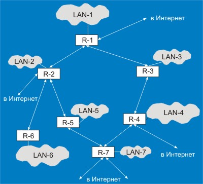 Рис. 1..2. Распределение публикаций документов RFC по годам с 1969 по 1999 Из этого распределения видно, что к 1979 году окончательно сформировался стек базовых протоколов и начался экстенсивный рост сети Интернет. По мере выявления недостатков протоколов и новых потребностей после 1989 года началась активная разработка новых направлений и приложений в Интернет. Но все по порядку. Начнем с того, как устроен Интернет. На рис. 1..3 показана общая схема, которая облегчит дальнейшее обсуждение данной проблематики (буквами R отмечены маршрутизаторы-порты локальных сетей). Каждая из сетей, составляющих Интернет, может быть реализована на разных принципах, это может быть Ethernet (наиболее популярное оборудование), Token Ring (вторая по популярности сеть), ISDN, X.25, FDDI или Arcnet. Все внешние связи локальной сети осуществляются через порты-маршрутизаторы (R). Если в локальной сети использованы сети с разными протоколами на физическом уровне, они объединяются через специальные шлюзы (например, Ethernet-Fast_Ethernet, Ethernet-Arcnet, Ethernet-FDDI и т.д.). Выбор топологии связей определяется многими факторами, не последнюю роль играет надежность. Использование современных динамических внешних протоколов маршрутизации, например BGP-4, позволяет автоматически переключаться на один из альтернативных маршрутов, если основной внешний канал отказал. Поэтому для обеспечения надежности желательно иметь не менее двух внешних связей. Сеть LAN-6 (см. рис. 1.3) при выходе из строя канала R2-R6 окажется изолированной, а узел LAN-7 останется в сети Интернет даже после отказа трех внешних каналов. Широкому распространению Интернет способствует возможность интегрировать самые разные сети, при построении которых использованы разные аппаратные и программные принципы. Достигается это за счет того, что для подключения к Интернет не требуется какого-либо специального оборудования (маршрутизаторы не в счет, ведь это ЭВМ, где программа маршрутизации реализована аппаратно). Некоторые протоколы из набора TCP/IP (ARP, SNMP) стали универсальными и используются в сетях, построенных по совершенно иным принципам.