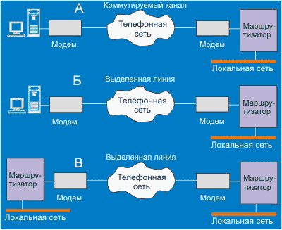 Рис. 1.4. Рост числа узлов WWW в период 1994-99 годы В перспективе Интернет может стать и всемирной ярмаркой товаров и услуг. Ведь клиент может не только увидеть изображение товара и ознакомиться с условиями поставки, но и в диалоговом режиме получить ответы на интересующие его вопросы, а затем одним нажатием на клавишу мышки сделать заказ на понравившийся ему товар или услугу. В принципе для этого не нужен даже номер кредитной карточки, его заменит зашифрованный соответствующим образом идентификатор пользователя (сертификат) или его IP-адрес (если он работает на своей домашней машине). Таким образом, можно будет заказывать билеты на самолет или в театр, планировать программу своего телевизора на неделю вперед и т. д. Современные системы мультимедиа позволяют совместить телевизор, видеомагнитофон, факс и видеотелефон, причем это не фантазия на тему далекого будущего - это услуги доступные уже сегодня (при наличии широкополосного канала связи (64-512 Кбит/с)). Если вы имеете доступ к Интернет, вам уже не нужно платить за международные телефонные переговоры, вы можете сделать это с помощью ip-phone или другого аналогичного продукта, при условии что ваш партнер также имеет доступ к Интернет (данное требование в ближайшем будущем перестанет быть обязательным). Все более широкий круг услуг предлагает Интернет и в сфере развлечений. Здесь имеются игровые серверы, аренда обычных и сетевых компьютерных игр, различные конкурсы и соревнования. Теперь рассмотрим, как строятся каналы связи (стрелки на рис. 1.5). В простейшем случае связь можно организовать через городскую коммутируемую телефонную сеть, для этого нужны модемы - по одному на каждой из сторон канала (Рис. 1.5a). Традиционные модемы могут обеспечить при хорошем качестве коммутируемой аналоговой телефонной сети пропускную способность до 56 Кбит/с (кабельные широкополосные модемы при длине соединения порядка 2км могут обеспечить 2 Мбит/с). Привлекательность такого решения заключается в возможности подключения к любому узлу, имеющему модемный вход. Наиболее широко указанный метод связи используется для подключения к узлам Интернет домашних ЭВМ. Недостатком такого решения является низкая надежность канала (особенно в России), малая пропускная способность и необходимость большого числа входных телефонных каналов и модемов. Использование выделенной 2- или 4-проводной линии (рис. 1.5Б) обеспечивает большую надежность и пропускную способность (до 256 кбит/с при длинах канала < 10 км). Но и здесь на каждый вход требуется отдельный модем, да и скоростные модемы, работающие на выделенную линию, относительно дороги. Выделенные линии чаще служат для межсетевого соединения (рис. 1.5В). Функциональным аналогом выделенных линий являются оптоволоконные, спутниковые и радио-релейные каналы. Этот вариант позволяет строить сети с пропускной способностью в несколько 1-100 Мбит/с и более. Привлекательные возможности предлагают цифровые сети ISDN. Здесь можно использовать групповые телефонные номера, когда пара модемов обслуживает 10 и более пользователей (ведь они работают, как правило, не все одновременно). Кроме того, ISDN предлагает пользователям каналы с пропускной способностью не ниже 64кбит/c, а при необходимости возможно формирование и более широкополосных каналов. ISDN позволяет делить один и тот же канал между мн