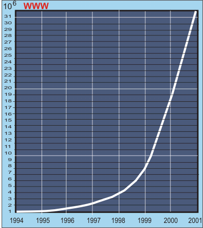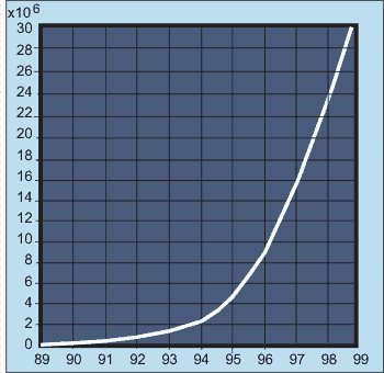 Рис. 1.3. Схема построения сети Интернет В некотором смысле Интернет возник эволюционно - в начале был Bitnet, fidonet, usenet и т.д. Со временем стало ясно, что конкуренция сетей должна быть заменена их объединением, так как от этого выигрывают все и пользователи и сервис-провайдеры. Ведь объединенная сеть имеет большие информационные ресурсы, может предложить более широкий список услуг и становится по этой причине привлекательной для еще большего числа клиентов. Технология WWW-серверов сделала Интернет важной средой для целевой рекламы, приближенной к конечному потребителю. Стремительный рост числа узлов www продемонстрирован на рис. 1.4. Здесь также наблюдается экспоненциальный рост. Сам факт использования Интернет для обливания грязью кандидатов во время предвыборной компании, говорит о том, что эта технология освоена и признана эффективной нашими политиками. Наше общество с удивительным упорством сначала осваивают все негативное, оставляя, очевидно, позитивное на десерт.