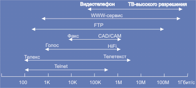 Рис. 1.5. Схемы каналов, использующих городскую телефонную сеть На рис. 1.5 показана схема построения сети с использованием исключительно соединений типа точка-точка. Это наиболее часто встречающийся, но не единственный вариант. Дорога 'от околицы до околицы' прокладывается там, где она нужна и теми, кому она нужна непосредственно, но, согласитесь, построить так магистраль Москва Санкт-Петербург нельзя. При построении крупных общенациональных и интернациональных сетей применяются сверхширокополосные каналы и схемы типа опорной сети (backbone). Узлы такой сети могут располагаться в каких-то крупных организациях или быть самостоятельными (принадлежать государственным PTT). Такие сети обычно базируются на протоколах SDH (Sonet). Информация в этих сетях передается в виде больших блоков (виртуальных контейнеров). Использование опорной сети обычно оправдано при организации интернациональных связей, но бывают и исключения. Примером такого исключения является Московская опорная сеть, построенная на основе FDDI (100Мбит/с) и объединяющая более десяти научных организаций (длина первой очереди около 30 км). Московская сеть выполнена по схеме с 'прозрачными' IP-мостами, обычно же более мощные опорные сети маршрутизируемы, то есть блоки данных адресуются конкретным узлам, где они разбираются и сортируются. Контейнер может содержать сообщения, адресованные разным получателям, что несколько противоречит идеологии протоколов TCP/IP. IP-пакеты могут вкладываться в эти контейнеры и транспортироваться до заданного узла опорной сети. Классическим примером опорной сети является E-bone (Европейская опорная сеть). Эта сеть объединяет 27 стран (России в этом списке нет) и более 60 сервис-провайдеров, пропускная способность для различных участков лежит в пределах 2-34Мбит/с. Опорная сеть подобна международной автомагистрали, по ней добираются до ближайшего к точке назначения узла, а далее по 'проселочным' каналам до конечного адресата. Резкое увеличение передаваемых объемов информации в локальных и региональных сетях привело к исчерпанию имеющихся ресурсов, а реальные прогнозы потребностей указывают на продолжение роста потоков в десятки и сотни раз. Единственной технологией, которая способна удовлетворить эти потребности, являются оптоволоконные сети (Sonet, SDH, ATM, FDDI, Fiber Channel). Каналы этих сетей уже сегодня способны обеспечить пропускную способность 155-622 Мбит/с, ведутся разработки и испытания каналов с пропускной способностью в 2-20 раз больше, например, гигабитного ethernet. Осваивается техника мультиплексирования частот в оптоволокне (WDM), что позволяет поднять его широкополосность в 32 раза и в перспективе довести быстродействие каналов до 80 Гбит/с и более. По мере роста пропускной способности возрастают проблемы управления, синхронизации и надежности. Практически все сети строятся сегодня с использованием последовательных каналов. Это связано прежде всего со стоимостью кабелей, хотя и здесь существуют исключения (например, HIPPI). Разные сетевые услуги предъявляют разные требования к широкополосности канала. На рис. 1.6 представлены частотные диапазоны для основных видов телекоммуникационных услуг. В Интернет практически все перечисленные услуги доступны уже сегодня (кроме ТВ высокого разрешения). Стремительно развиваются распределенные системы вычислений (напр