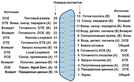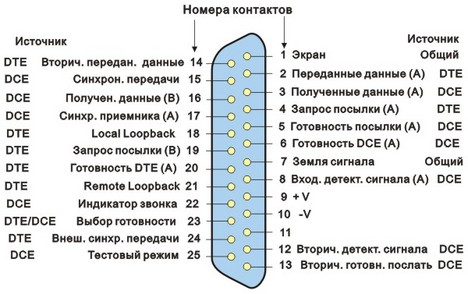 | Номер контакта | Сторона ЭВМ (DTE) Разъем DB25M | Устройство передачи данных (DCE) Разъем DB25F |
