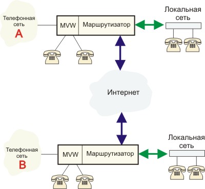 Рис. 4. Схема IP-телефонной сети На рисунке MVW-модуль (Multiflex Voice/WAN), включаемый в маршрутизатор, например, CISCO-3662, служит для связи с общедоступной телефонной сетью. Если сеть “А” размещена в Рио-де-Жанейро, а “В” в Москве, то любой клиент нижней сети сможет разговаривать с клиентом в Рио “бесплатно”, а с клиентами телефонных сетей “А” и “B” по локальным тарифам. В левой части рисунка показаны телефонные аппараты, которые подключаются непосредственно к сегменту локальной сети. Такие приборы уже поступили в продажу. Грядет интеграция цифрового телевидения, телефонии (включая видео-телефонию) и Интернет, звуковые и видео письма уже реальность. Схема построения интерактивной сети цифрового кабельного телевидения показана на рис. 5.