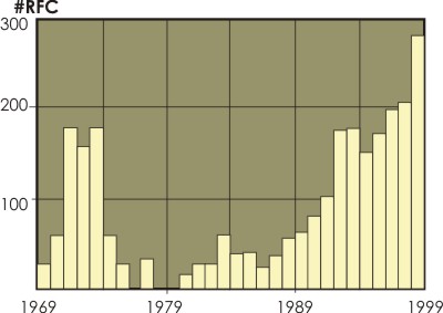 Оглавление: Телекоммуникационные технологии Вперёд: 10.26. Таблица цветов, их имен и кодов 10.25. Интернет вчера, сегодня и завтраСемёнов Ю.А. (ГНЦ ИТЭФ), book.itep.ruЕсли считать началом Интернет реализацию проекта ARPA-Net, то время его существования насчитывает более 31 года. Ведь в 1969 году был подготовлен документ RFC-1. Замечу, что протоколы Ethernet были сформированы лишь в 1973-79 годах. Интернет в РФ на 20 лет моложе. Динамику развития этой технологии можно проследить по темпу выпуска RFC (смотри рис. 1). В 2000 году ожидается не менее 250 публикаций.