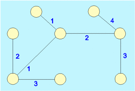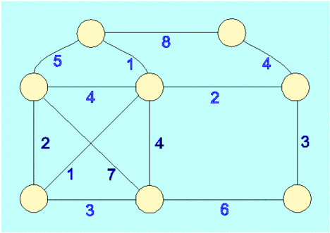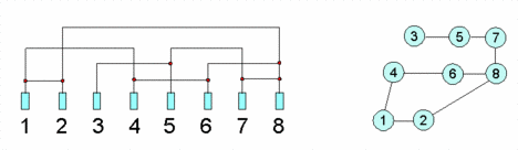 Рис. 10.21.5. Конечная последовательность ребер графа e1, e2,…,en называется маршрутом длины n. Маршрут называется замкнутым, если вершины начала и конца маршрута совпадают. Если ребра, образующие маршрут различны, то такой маршрут называется цепью. Граф называется деревом, если он связан и не имеет циклов. Граф является деревом тогда и только тогда, когда каждая пара различных вершин соединяется одной и только одной цепью. Каждое дерево с n вершинами имеет ровно n-1 ребро. Удаление любого ребра в дереве делает его несвязным. По этой причине дерево можно считать минимальным связным графом. Если все вершины графа G принадлежат дереву Т, то считается, что дерево покрывает граф G. Граф, не имеющий циклов и состоящий из k компонент, называется лесом из k деревьев. Лес из k деревьев, содержащий n вершин имеет в точности n-k ребер. Пусть G=(v,e) связный граф и FМ E подмножество его ребер. При этом F называется разделяющим подмножеством тогда и только тогда, когда подграф G'=(V, E-F) несвязан. E-F обозначает множество ребер, которое принадлежит Е, но не принадлежит F. Если узлы графа могут быть соединены несколькими путями, сеть, описываемая таким графом, обладает повышенной надежностью. Рассмотрим задачу выбора оптимального дерева маршрутов, лишенного циклов, в такой сети (см. рис. 10.21.6). Алгоритм используется в схеме "расширяющееся дерево" для локальных сетей со сложной топологией. Алгоритм преобразует многосвязный граф в плоский без замкнутых структур.