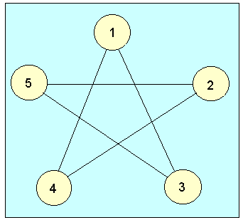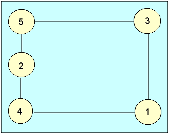 Рис. 10.21.3а. Преобразование графа с рис 3 Матрица смежности, характеризующая этот граф, эквивалентна приведенной на рис. 10.21.3, а сами графы изоморфны. Для представления графа может использоваться Булева функция S(x,y), для которой S(i,j)=1 тогда и только тогда, когда (i,j)О E. S(i,j) обозначает ребро графа, соединяющее узлы i и j. Одной из возможностей реализации s является использование матрицы смежности А графа g. А - двухмерная матрица. Для описания графа с помощью матрицы смежности A(i,j), где (i,j)О E, необходимо пронумеровать узлы графа. Элементы матрицы могут принимать значения 0 или 1. Так как представленный на рисунке граф не имеет ребер исходящих и завершающихся в одном и том же узле (нет петель), диагональные элементы матрицы равны нулю. Единицы присутствуют в позициях, которые соответствуют парам узлов, соединенных ребрами, например, 1-3, 1-4 или 5-2 и 5-3. Число ребер, исходящих из вершины (петля учитывается дважды), называется степенью вершины d(v). В конечном графе число вершин с нечетной степенью всегда четно. Другой способ представления графа обеспечивает функция, которая выдает списки узлов, с которыми данный узел связан непосредственно. Для графа, отображенного на рис. 10.21.4, такое описание можно представить в виде структуры (таблица 10.21.1). В колонке s представлены номера узлов, далее в строке таблицы следует список соседних узлов. По этой причине число колонок в каждой из строк различно.
