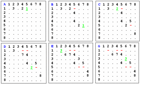 Рис. 10.21.6. В качестве начального выбираем узел 1. Матрица оценки формируется поэтапно (А-E). На этапе А выбирается узел 5, так как к нему ведет ребро с метрикой 1. Здесь становятся доступными ребра, ведущие к узлам 2, 4, 6 и 7. Ребро 1-5 из рассмотрения устраняется. На следующем этапе выбирается узел 7, к нему от узла 5 ведет ребро с метрикой 1. Здесь в рассмотрение включаются ребра 7-4 и 7-8. Следующим выбранным узлом становится 4 и включается в перечень ребро 4-2. Далее рассматривается узел 6 и ребра 6-8 и 6-3.