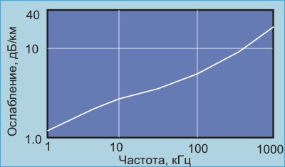 Оглавление: Телекоммуникационные технологии Вперёд: 2.1.1. Влияние шумов и помех 2.1. Передача сигналов по линиям связиСемёнов Ю.А. (ГНЦ ИТЭФ), book.itep.ruТеорема Шеннона ограничивает предельную пропускную способность канала I с заданной полосой пропускания F и отношением сигнал/шум S/N : Для стандартного телефонного канала F=3кГц, N/S=30db, следовательно, теоретический предел для публичной коммутируемой телефонной сети равен примерно 30кбит/с. Ослабление для телефонных скрученных пар составляет около 15 дБ/км, дополнительные ограничения возникают из-за перекрестных наводок. Если рассмотреть сигнал с полосой F, то согласно теореме Найквиста частота стробирования должна быть равна или больше 2F. При использовании больших частот стробирования можно получить при воспроизведении более высокие гармоники, но они при заданной полосе пропускания все равно будут подавлены. При N дискретных уровнях преобразования максимальный поток данных составит 2F log2(N) бит/c, что при F=4кГц/c и N=256 даст 64 кбит/c. Практически при F=4кГц даже в отстутствии шума нельзя получить скорость передачи более 8 кбит/с (если передается один бит за такт). Стандартные проводные линии связи имеют ослабление 6 дБ/км на частоте 800 Гц, или 10 дБ/км на частоте 1600 Гц. На рис. 2.1.1 показана зависимость ослабления от частоты передаваемого сигнала для медной линии с сечением 0,5 мм.