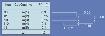 Рис. 2.6.5.1 Пример реализации алгоритма Хафмана На следующем шаге наименее вероятными сообщениями окажутся m(1) и m(2). Кодовые слова на полученном дереве считываются справа налево. Алгоритм выдает оптимальный код (минимальная избыточность). При использовании кодирования по схеме Хафмана надо вместе с закодированным текстом передать соответствующий алфавит. При передаче больших фрагментов избыточность, сопряженная с этим не может быть значительной. Возможно применение стандартных алфавитов (кодовых таблиц) для пересылки английского, русского, французского и т.д. текстов, программных текстов на С++, Паскале и т.д. Кодирование при этом не будет оптимальным, но исключается статистическая обработка пересылаемых фрагментов и отпадает необходимость пересылки кодовых таблиц. Назад: 2.6.4. Метод Шеннона-Фано |