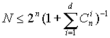 Описанная схема легко переносится на любое число n и М. Число возможных кодовых комбинаций М помехоустойчивого кода делится на n классов, где N – число разрешенных кодов. Разделение на классы осуществляется так, чтобы в каждый класс вошел один разрешенный код и ближайшие к нему (по расстоянию Хэмминга) запрещенные коды. В процессе приема данных определяется, к какому классу принадлежит пришедший код. Если код принят с ошибкой, он заменяется ближайшим разрешенным кодом. При этом предполагается, что кратность ошибки не более qm. Можно доказать, что для исправления ошибок с кратностью не более qm</sub кодовое расстояние должно превышать 2qm (как правило, оно выбирается равным D = 2qm +1). В теории кодирования существуют следующие оценки максимального числа N n-разрядных кодов с расстоянием D.