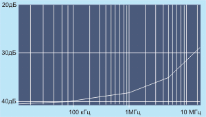Рис. 3.1.3. Зависимость наводок NEXT от частоты передаваемого сигнала. На рис. 3.1.4 представлена зависимость ослабления сигнала в неэкранированной скрученной паре (именно такие кабели наиболее часто используются для локальных сетей) от частоты передаваемого сигнала. Следует иметь в виду, что при частотах в области сотен мегагерц и выше существенный вклад начинает давать поглощение в диэлектрике. Таким образом, даже если проводники изготовить из чистого золота, существенного продвижения по полосе пропускания достичь не удастся.