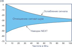 NEXT - Near End Cross Talk - перекрестные наводки ближнего конца кабеля. Такой кабель пригоден для передачи информации со скоростью более 1 Гбит/с. ACR - Attenuation-to-Crosstalk Ratio (отношение ослабления к относительной величине перекресных наводок). Ниже на рис. 3.1.3 показана зависимость наводок на ближнем конце кабеля, содержащего скрученные пары, (NEXT - Near End CrossTalk) от частоты передаваемого сигнала.