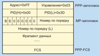 Рис. 3.5.5. Формат MР-пакета Поля PID - идентификатор протокола. Субполе B (Beginning) - бит фрагмента =1 для первого фрагмента PPP и =0 для всех последующих фрагментов. Субполе E (Ending) - бит фрагмента =1 для последнего фрагмента PPP и =0 для всех прочих фрагментов. Поле номер по порядку имеет длину 24 бита. Существует модификация пакета с укороченным кодом (12 бит) номера по порядку. При этом к этому полю отходят 4 нулевые бита после BE00. Выбор длины этого поля осуществляется протоколом LCP. Значение полу увеличивается на 1 при посылке очередного фрагмента. Для вышерасположенных уровней совокупность совместно используемых каналов выглядит, как один виртуальный канал. При передаче пакетов по каналу Multilink инкапсуляция производится согласно следующим правилам, которые задаются вручную: