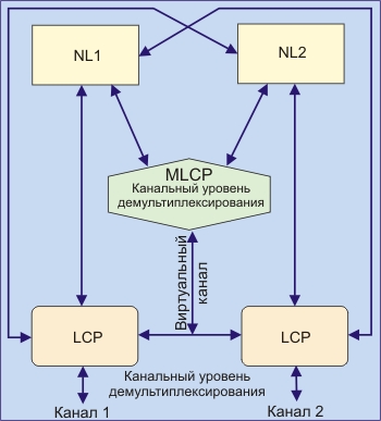 Для предварительно фрагментированных пакетов запрещено дополнение нулями или использование каких-либо иных заполнителей. Рассмотрим пример Multilink-соединения, приведенный на рис. 3.5.6. Канал 1 между двумя системами согласуется сетевыми уровнями NL1, NL2 и MP. Затем эти две системы согласуют с MP канал 2. Кадры, полученные каналом 1, демультиплексируются на канальном уровне согласно сетевому протокольному идентификатору PPP и могут быть посланы NL1, NL2 или MP. Канал 2 примет кадры со всеми сетевыми протокольными идентификаторами, с которыми принимает их канал 1. Кадры, полученные MP, позднее демультиплексируются на сетевом уровне согласно протокольному идентификатору PPP и посылаются NL1 или NL2. Любые кадры, полученные MP для других протоколов сетевого уровня, отбрасываются с помощью стандартного протокольного механизма (Reject).