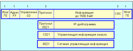 Протокол управления каналом (LCP - Link Control Protocol) является частью PPP. Идеология NCP реализована и в протоколе TCP. Каждый кадр PPP начинается и завершается флагом 0x7E. За стартовым флагом-октетом следует байт адреса, который всегда равен 0xFF. Формат кадра PPP представлен на рисунке 3.5.1. Кадр ppp может содержать только целое число байт. При инкапсуляции других пакетов в PPP используется бит-ориентированный протокол HDLC (High-level Data Link Control).