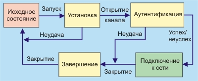 Значения кодов поля протокола от 0xxx до 3xxx идентифицируют протоколы сетевого уровня, а значения в интервале 8xxx - bxxx говорят о том, что протокол соответствует NCP (Network Control Protocol). Коды из диапазона 4xxx - 7xxx используются для протоколов с низким уровнем трафика, а коды от cxxx до exxx соответствуют управляющим протоколам (например, LCP). Протокол PPP при установлении соединения предусматривает процедуру аутентификации, которая является опционной (смотри рис. 3.5.2.). После перехода на сетевой уровень вызывается NCP-протокол, который выполняет необходимую конфигурацию канала.