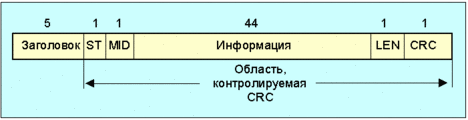 Рис. 4.1.9.1. Формат ячейки DQDB (цифры в верхней части рисунка характеризуют длины полей) Поле ST (segment type) характеризует тип сегмента. Поле MID (message identifier) представляет собой идентификатор сообщения. LEN –характеризует длину поля данных, а CRC – это контрольная сумма ячейки. Когда станция намерена передать ячейку, она должна знать, справа или слева от нее находится место назначения. Если место назначения справа, отправитель использует шину А, в противном случае передача производится по шине В. Для ввода данных на шину применяется схема проволочного ИЛИ. По этой причине обесточенная станция не вызовет отказа всего сегмента сети. Станция образуют очередь для передачи в порядке поступления заявок (fifo). Структура заголовка ячейки показана на рис. 4.1.9.2 она весьма схожа с той, что имеет ячейка atm.